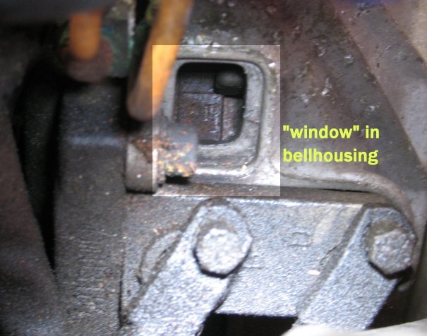 December 15, 2009 I had some difficulting finding the timing mark on the flywheel. With the help of a dowel in #1 spark plug hole, and also removing the electrial connector assembly obscuring the 'window', I was able to get it to TDC.